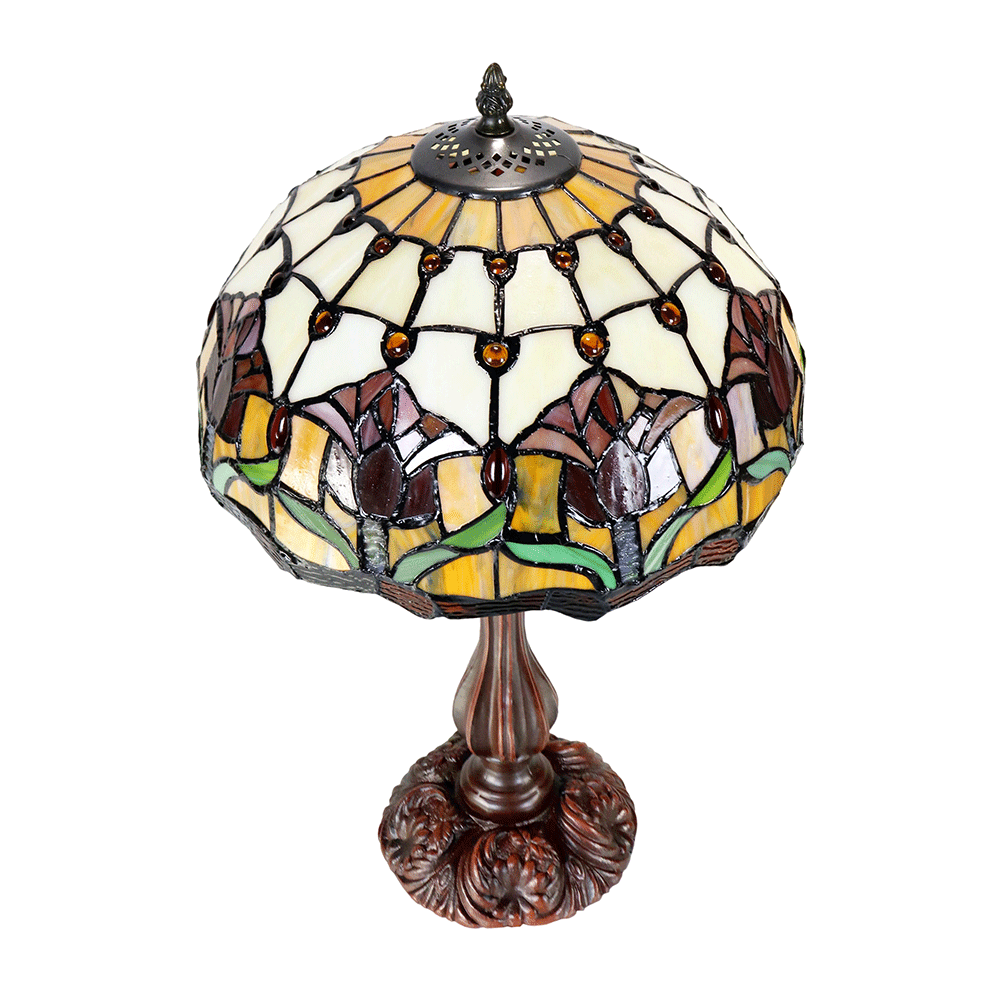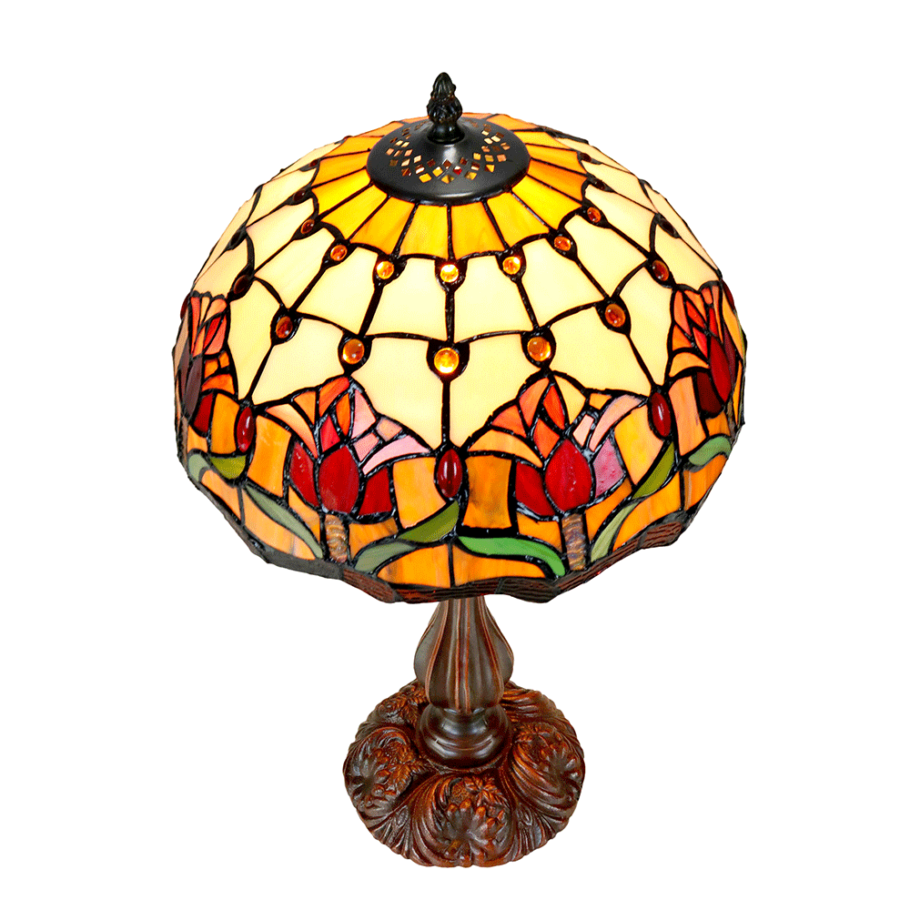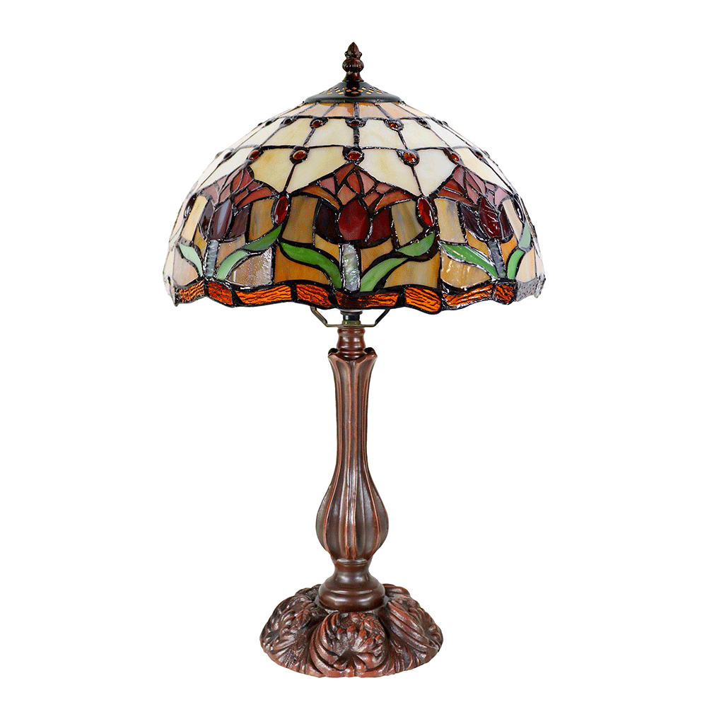 Features a handcrafted red tulip design in a stained-glass shade with a brown resin base carved traditionally.